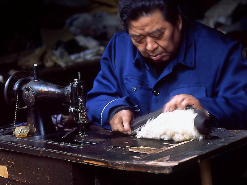 如今的人们大多买成品衣服了,老裁缝的手艺也只好用来缝缝补补,这是在做一件羊毛坎肩。