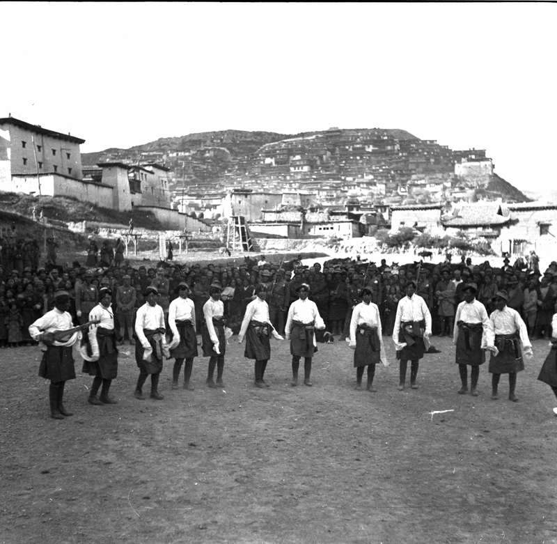 甘孜寺外九世班禅卫队追念九世班禅跳起踢踏舞。19世纪初英国侵藏军中的爱尔兰军人把踢踏舞从后藏带回爱尔兰并传入美国,成为20世纪初美国盛行的舞蹈。