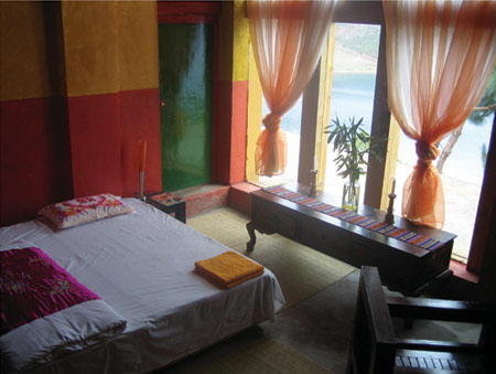 博物馆二楼是娜姆自己的房间,里面洋溢着娜姆特有的风格:有东方神秘的色彩,也有西方的现代气魄。蓝、粉、明黄,是娜姆家中的主色调。房间的旁边两间,是用来提供给国内外艺术家免费入住的,他们可以住一到三个月,在泸沽湖边风水最好的地方沉静、思考、创作,走时,只需要留下一幅自己的作品。