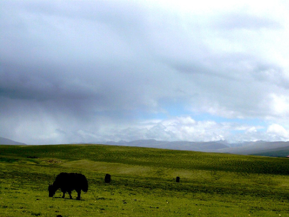 高原上的冰雹通常是在下午接近黄昏的时候来临的, 当满山的云层突然向下压, 翻过四周山的顶端向一块小小的地方聚集时, 天色几乎完全黑了下来, 当冷云的浓度达到足够时与草地上谷人的空气接? 凝聚的小冰块在下坠中没有足够的距离化为雨水, 它们就打在了地下, 小块的冰雹在地上溅得乱滚, 大的冰雹直接嵌进了草地, 只几分钟的时间, 地上就成了白花花的一片, 在六月的夏天里, 每次冰雹来临只有不超过五六分钟的时间, 冰雹停下来以后, 地面上, 特别是公路上开始冒起一层白雾, 乌云也被冰雹打得千疮百孔, 夕阳透射进来以后把这些小孔不断扩大, 不一会, 云开雾散, 湿润的高山草甸在黄昏的夕阳下看上去格外的清新和色彩艳丽。