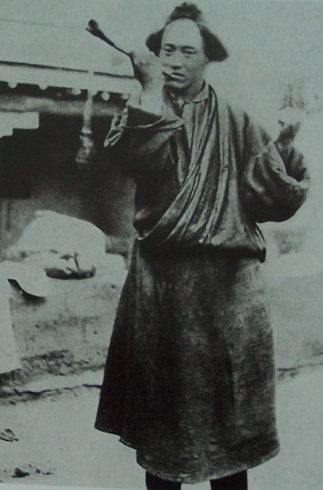 一名藏族人正在吹响一支饰以金、银和宝石,用人的大腿骨制成的法号。他左手中拿着一个用两个人的头盖骨作成的小鼓。
